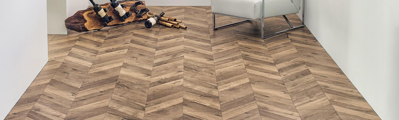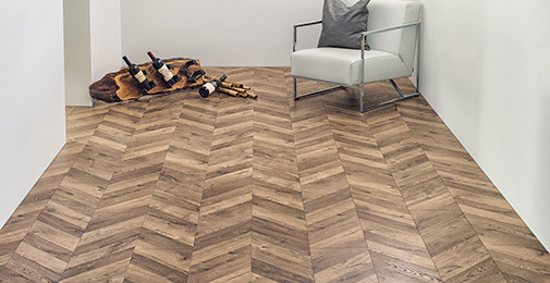 A modern interpretation of classic herringbone flooring: Oak Preston is a medium-brown to dark-brown oak flooring decor with a surface structure that feels authentic to the touch.