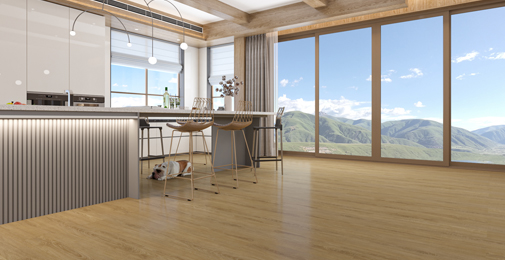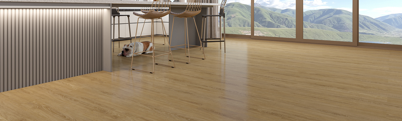 Stone Ploymer Composite water resistant floor planks in a light brown colour with a double layer of UV coating. Easy to insatall floors, comes with an IXPE backing and click locking system.