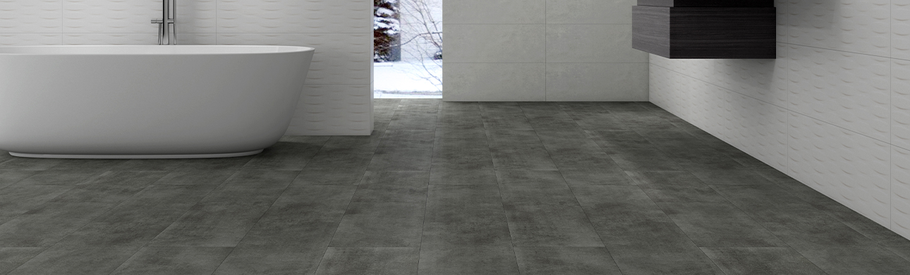 Stone Ploymer Composite water resistant floor planks in a stone finish and a dark grey color with a double layer of UV coating. Easy to insatall floors, comes with an IXPE backing and click locking system.